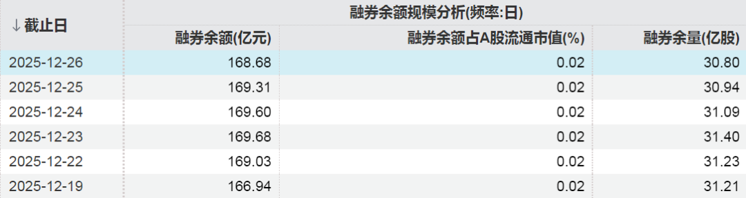 数据显示,截至12月26日,A股市场融券余额为168.68亿元,上周融券余额增加1.74亿元,融券余量为30.80亿股。