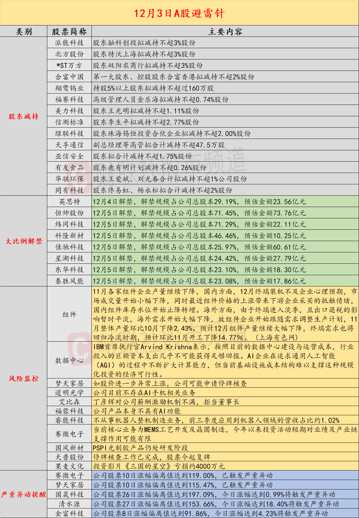 导读:财联社12月3日投资避雷针,近日,A股及海外市场潜在风险事件如下。国内经济信息方面包括:1)国内商品期市夜盘收盘多数下跌,非金属建材跌幅居前;2)12月组件排产预计大降,终端需求将回归冷淡时期;公司方面重点关注包括:1)10天7板梦天家居表示,如股价进一步异常上涨,公司可能申请停牌核查;2)4连板道明光学公告,公司目前不存在AI手机相关业务;海外市场重点关注包括:1)纳斯达克中国金龙指数收跌0.65%,热门中概股多数下跌;2)IBMCEO称以现有成本建设AI数据中心“几乎不可能回本”。