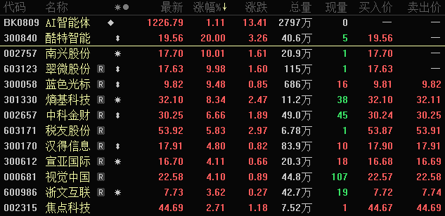 今日早盘,AI智能体相关概念股走强,其中酷特智能)