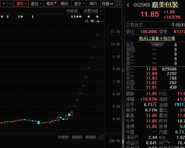 href=/002969/>嘉美包装(002969)早盘再次涨停,盘中涨停板封单超过80万手。该股自12月17日以来连续录得10个涨停板,最新股价创近5年新高,A股市值达到110亿元以上。公司近期股价持续大涨,与一则股权转让公告密切相关。
