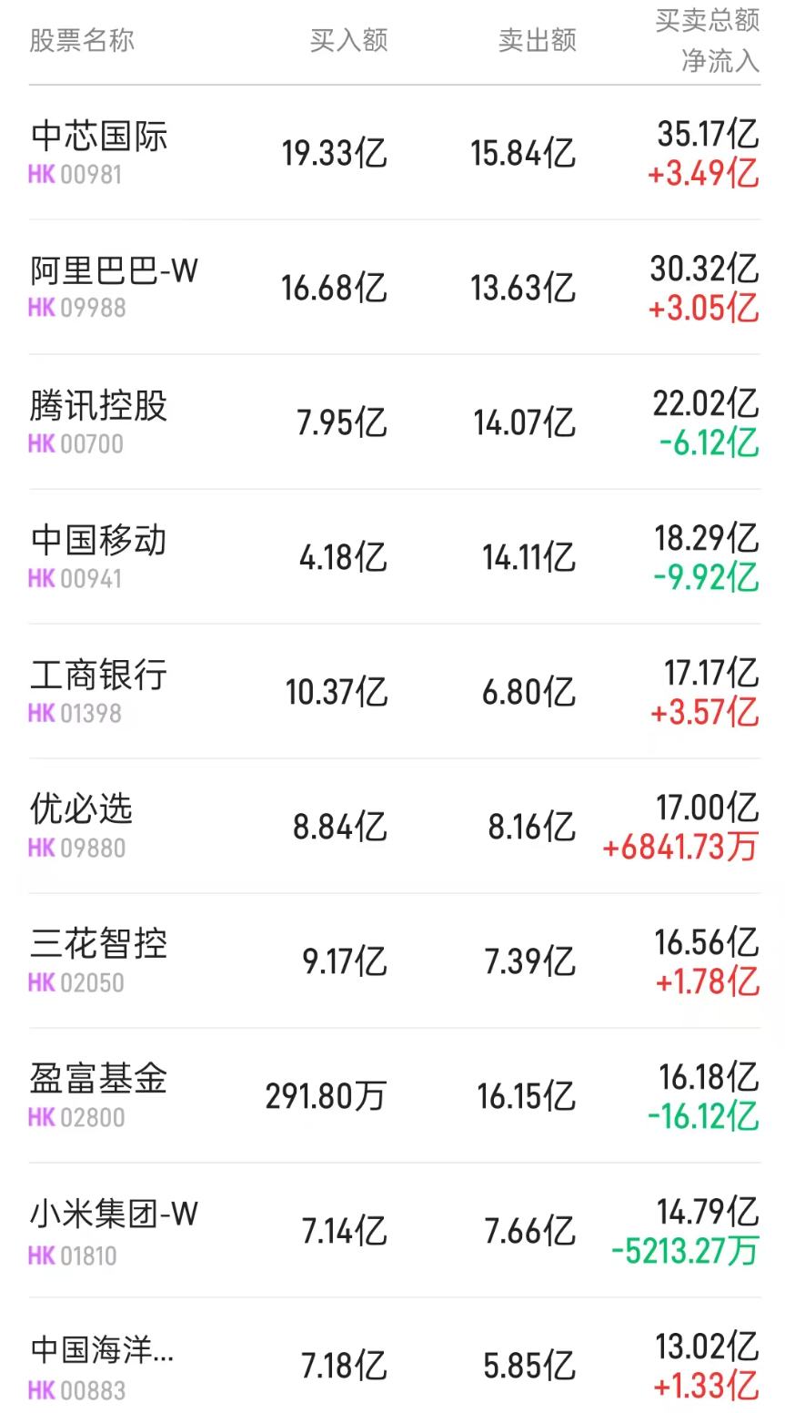 北水净买入最多的个股是中芯国际(00981)、中国海油(600938)(00883)、工商银行)