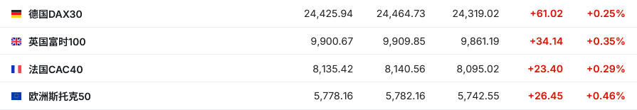 2. 截至发稿,德国DAX指数涨0.25%,英国富时100指数涨0.35%,法国CAC40指数涨0.29%,欧洲斯托克50指数涨0.46%。