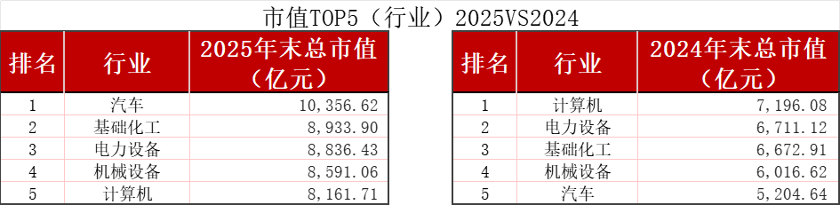 按行业看,截至2025年末,汽车行业浙股总市值近1.04万亿元,在31个申万一级行业中位列第一。2024年末,汽车行业浙股总市值还仅为 5204.64亿元,年内几乎翻倍。其中拓普集团(601689.SH)、万向钱潮)