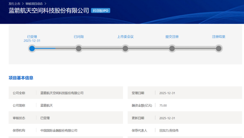 12月31日,上交所官网信息显示,蓝箭航天空间科技股份有限公司(以下简称“蓝箭航天”)科创板IPO申请获受理,正式冲刺科创板“商业火箭第一股”。