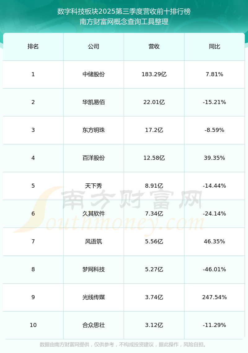 按照概念查询工具统计,该股所属板块为数字科技板块,该板块共有18只股票,风语筑2025第三季度营收在该板块中排名为第7名,该板块2025第三季度营收排名前十的股票如下表: