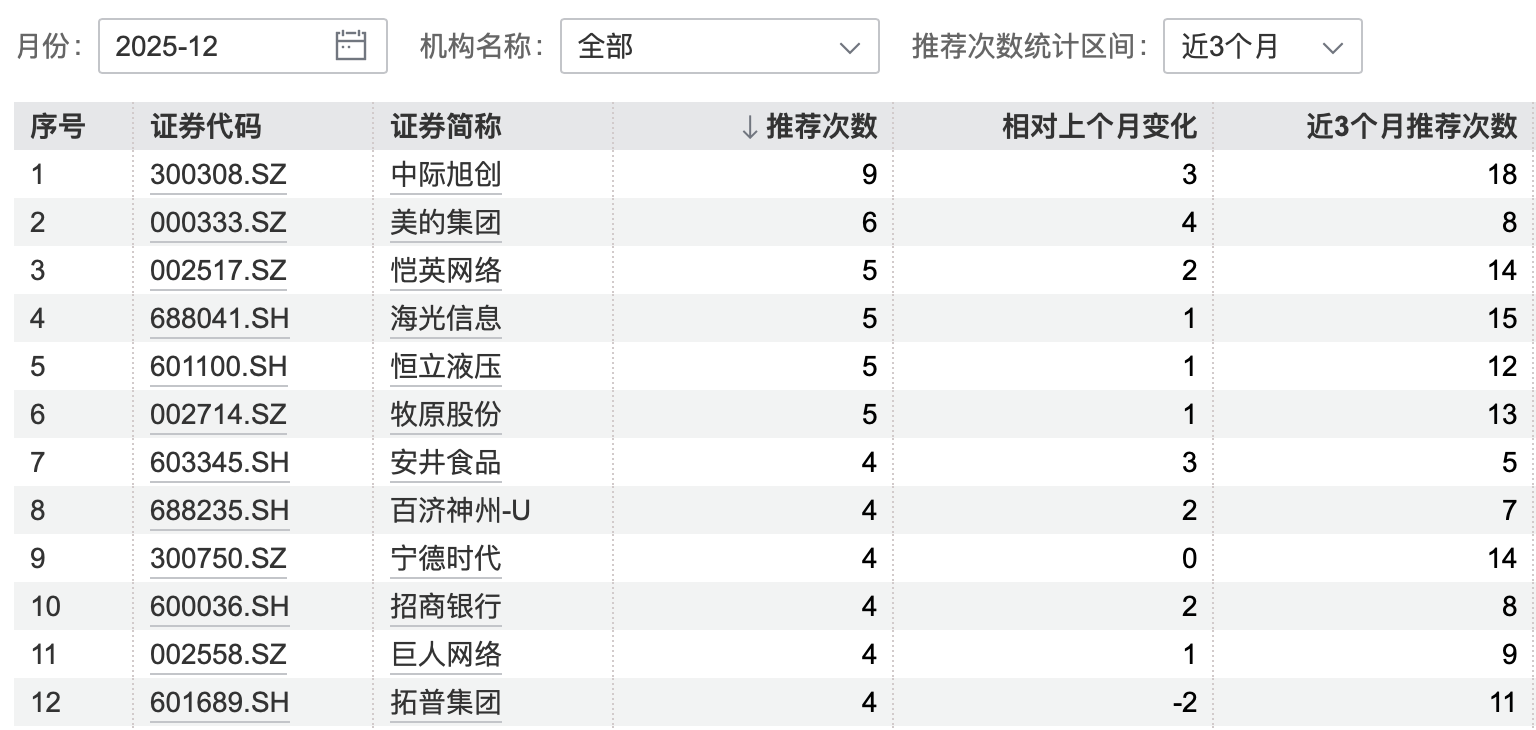 数据显示,截至12月3日中午,已有36家券商发布了12月金股推荐,共计推荐226只股票。在12月金股推荐榜中,中际旭创)