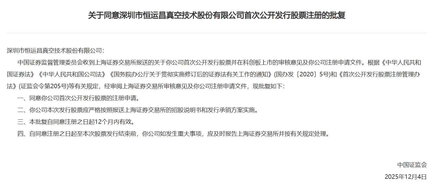 12月4日,中国证监会发布《关于同意深圳市恒运昌真空技术股份有限公司首次公开发行股票注册的批复》。据悉,恒运昌拟在上交所科创板上市,中信证券为保荐机构,拟募资15.50亿元。
