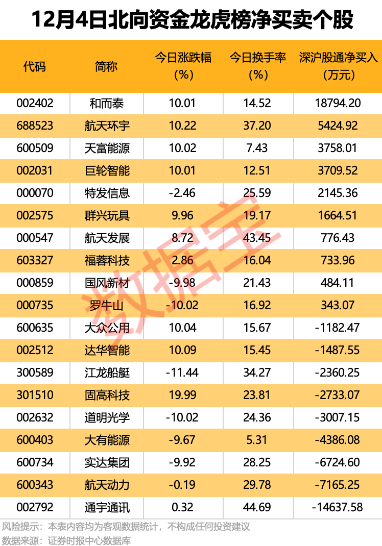 今日龙虎榜现身个股中,10股获北向资金净买入。净买入居首的是和而泰,金额为1.88亿元;航天环宇、天富能源)