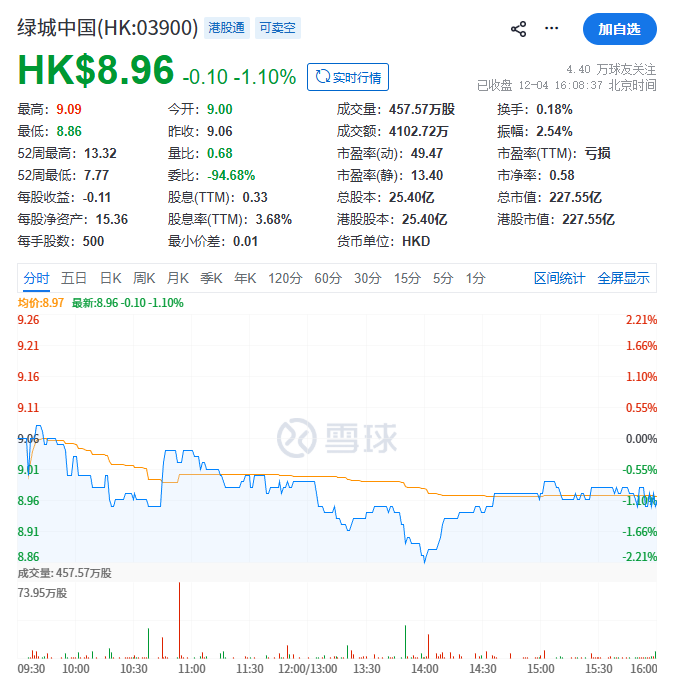 二级市场上,截至12月4日收盘,绿城中国跌1.1%,报8.96港元/股,总市值227.55亿港元。