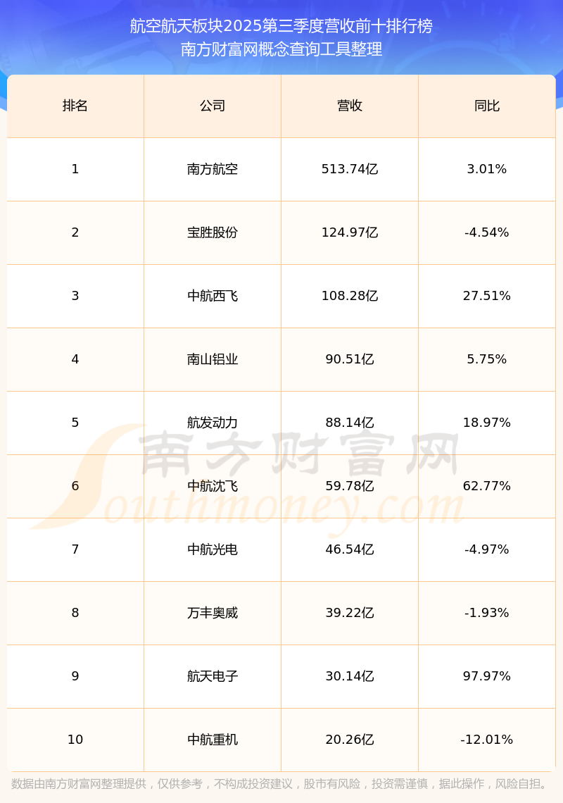 按照概念查询工具统计,该股所属板块为航空航天板块,该板块共有70只股票,航天环宇2025第三季度营收在该板块中排名为第70名,该板块2025第三季度营收排名前十的股票如下表: