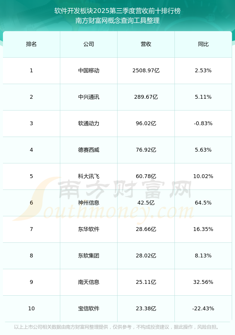 按照概念查询工具统计,该股所属板块为软件开发板块,该板块共有195只股票,泛微网络2025第三季度营收在该板块中排名为第53名,该板块2025第三季度营收排名前十的股票如下表: