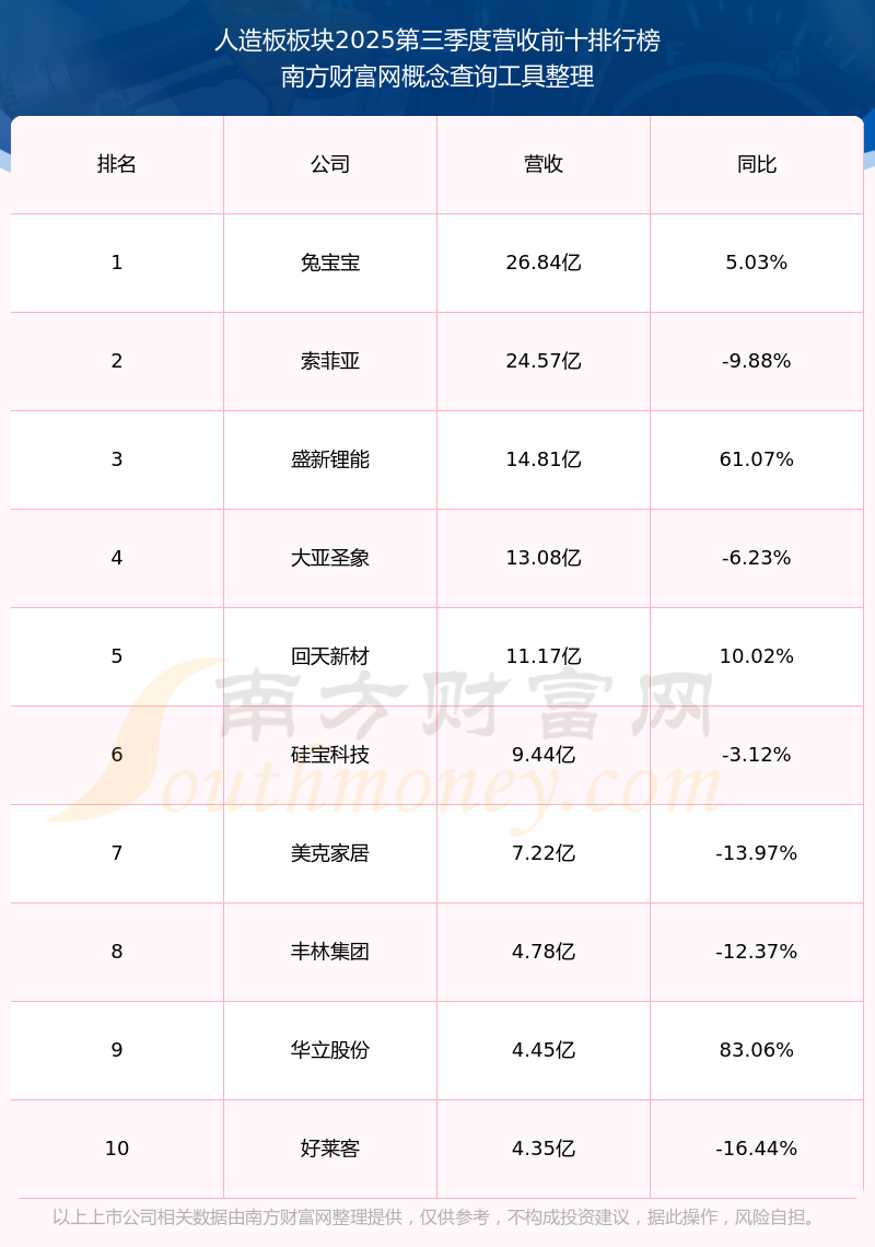 按照概念查询工具统计,该股所属板块为人造板板块,该板块共有22只股票,丰林集团2025第三季度营收在该板块中排名为第8名,该板块2025第三季度营收排名前十的股票如下表: