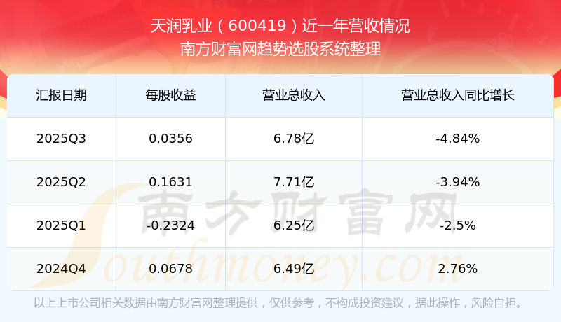 天润乳业(600419)披露2025年第三季度报告,报告期实现营收6.78亿元,同比-4.84%;归母净利润1124.18万元,同比-77.6%;扣非净利润1874.89万元,同比-62.71%。