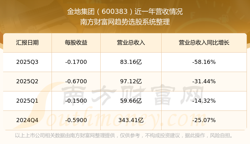 金地集团2025年第三季度报告显示,公司实现主营业务收入83.16亿元,较去年同期增长-58.16%;归属于母公司股东的净利润为-7.84亿元,同比增长-1491.76%;扣除非经常性损益后的净利润为-5.96亿元,同比增长-1682.01%。