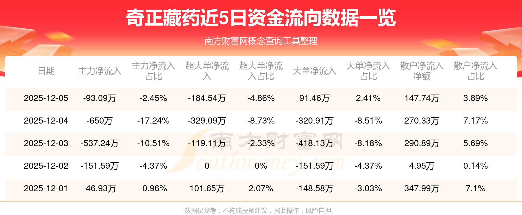 12月5日消息,奇正藏药12月5日主力净流出93.09万元,超大单净流出184.54万元,大单净流入91.46万元,散户净流入147.74万元。