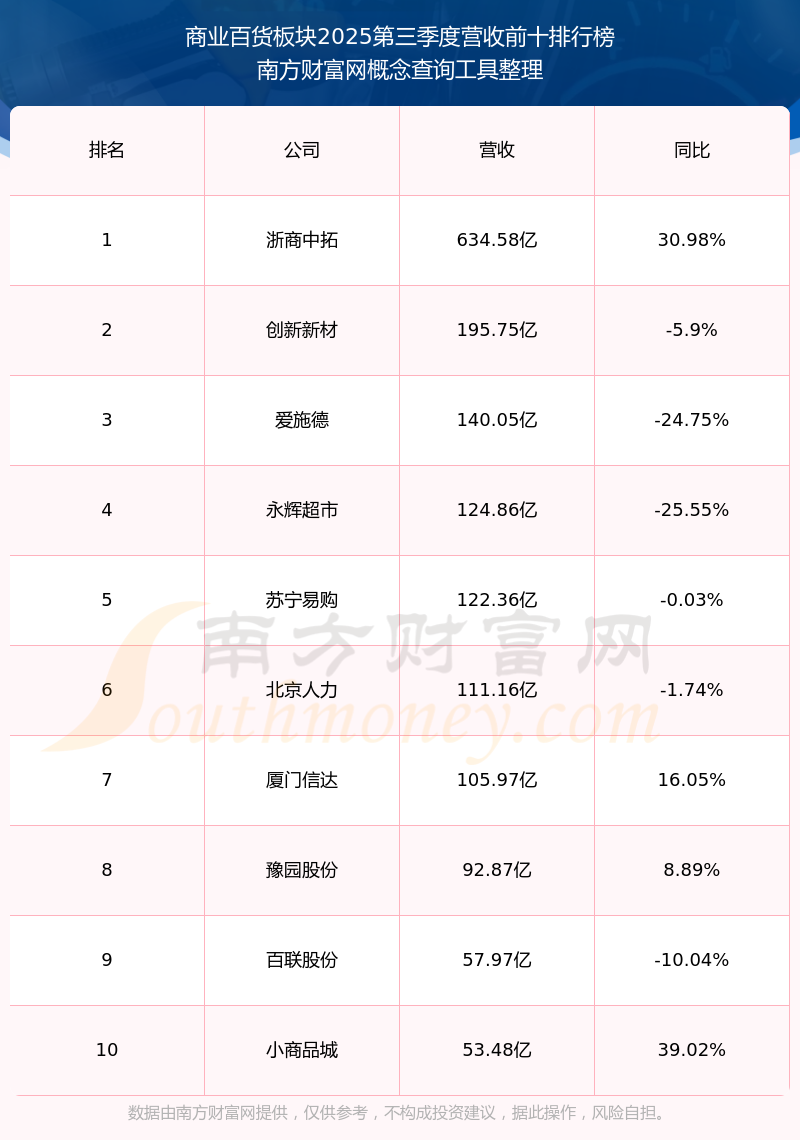 按照概念查询工具统计,该股所属板块为商业百货板块,该板块共有74只股票,轻纺城2025第三季度营收在该板块中排名为第60名,该板块2025第三季度营收排名前十的股票如下表: