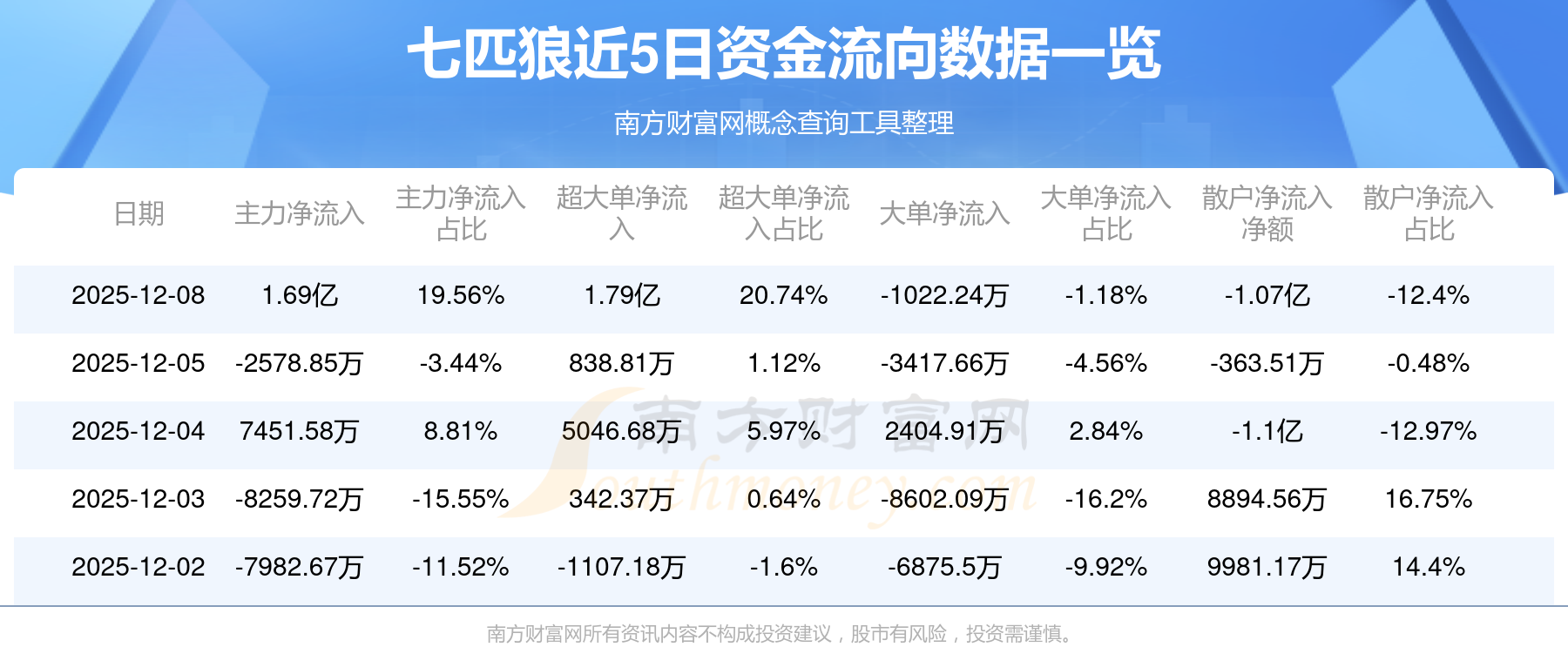 12月8日消息,七匹狼12月8日主力净流入1.69亿元,超大单净流入1.79亿元,大单净流出1022.24万元,散户净流出1.07亿元。