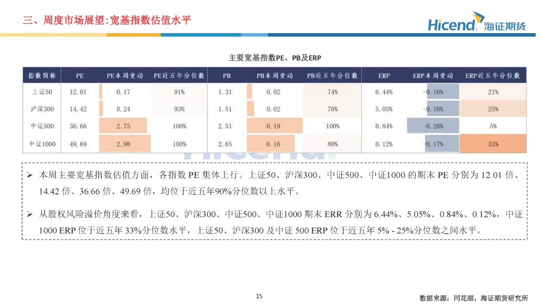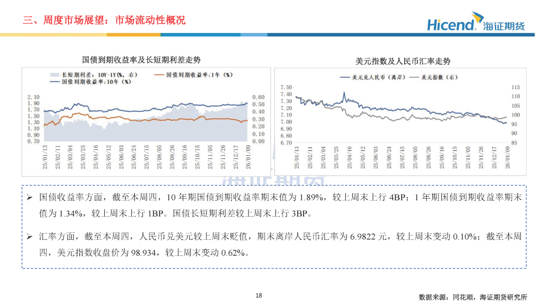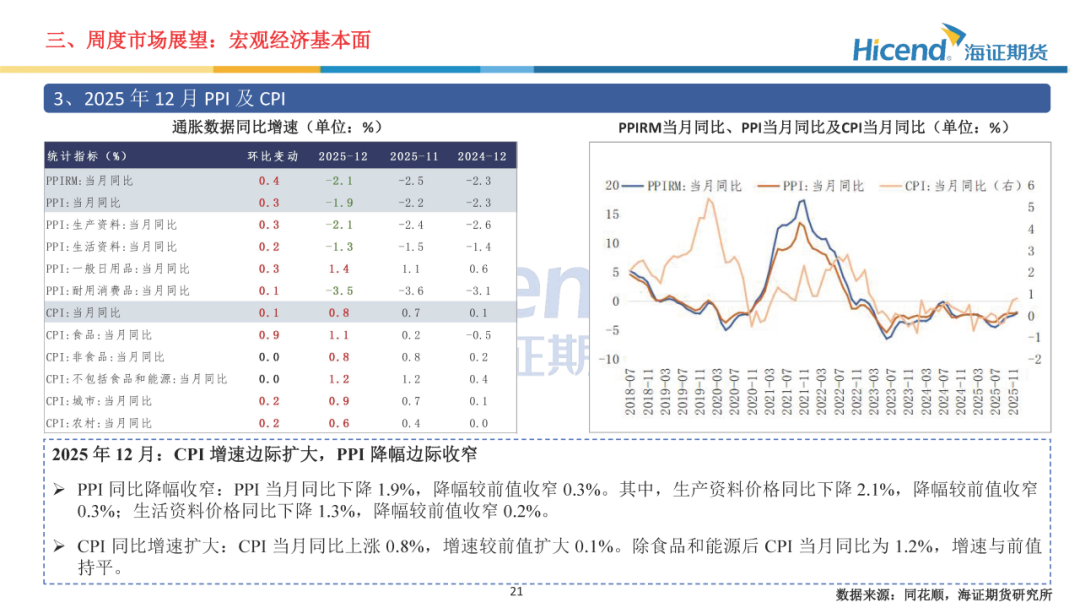 估值角度,主要宽基指数PE均有所上行。上证50、沪深300、中证500、中证1000的期末PE分别为12.01倍、14.42倍、36.66倍、49.69倍,均位于近五年90%分位数以上水平。流动性及资金面,截至本周四,10年期国债到期收益率期末值为1.89%,较上周末上行4BP;1年期国债到期收益率期末值为1.34%,较上周末上行1BP。国债长短期利差较上周末上行3BP。市场流动性环境相对宽松。融资数据方面,截至本周四,融资余额为2.62万亿元,周一到周四融资净买入额为790亿,资金参与情绪大幅上升。经济基本面,2025年12月PMI方面,制造业景气度回升至扩张区间。从制造业PMI分项指标来看,生产指数、新订单指数、新出口订单指数环比均有所上升,产需两端均有所改善;主要原材料购进价格有所回落,出厂价格环比有所回升,中下游企业毛利率有望得到改善。通胀数据方面,CPI增速边际扩大,PPI降幅边际收窄,核心CPI同比继续与前值持平。