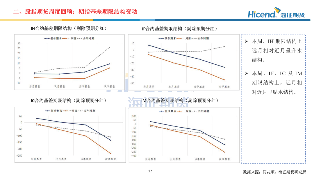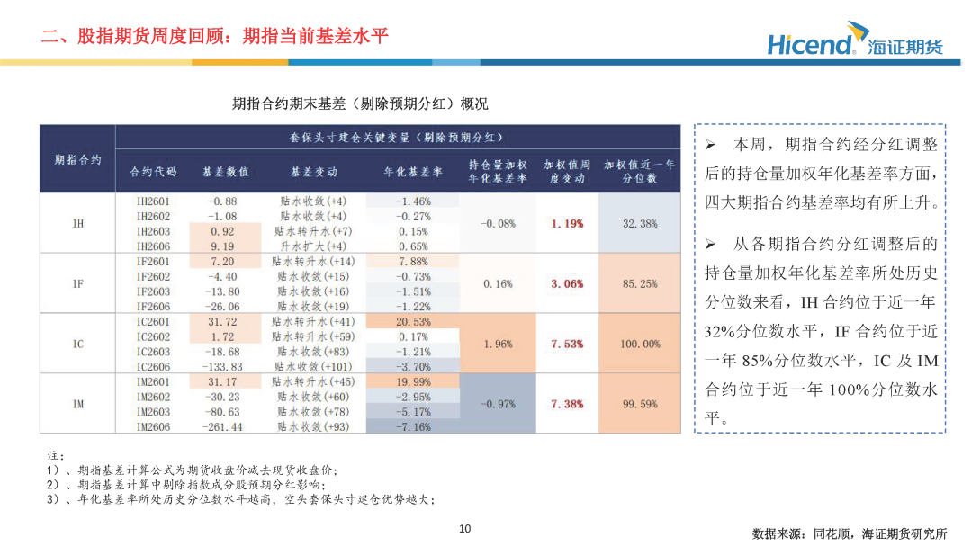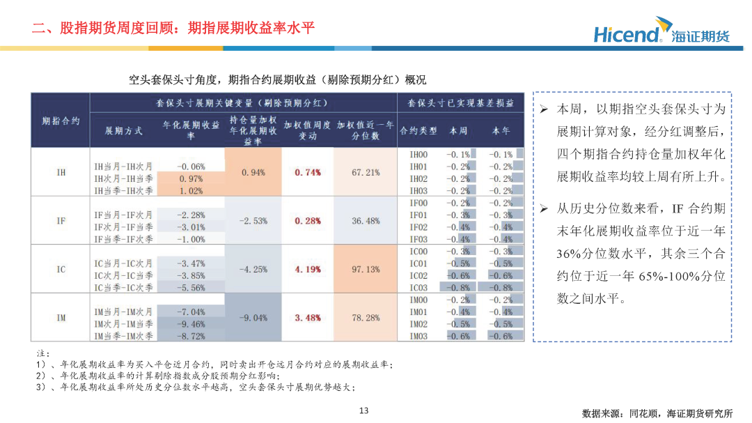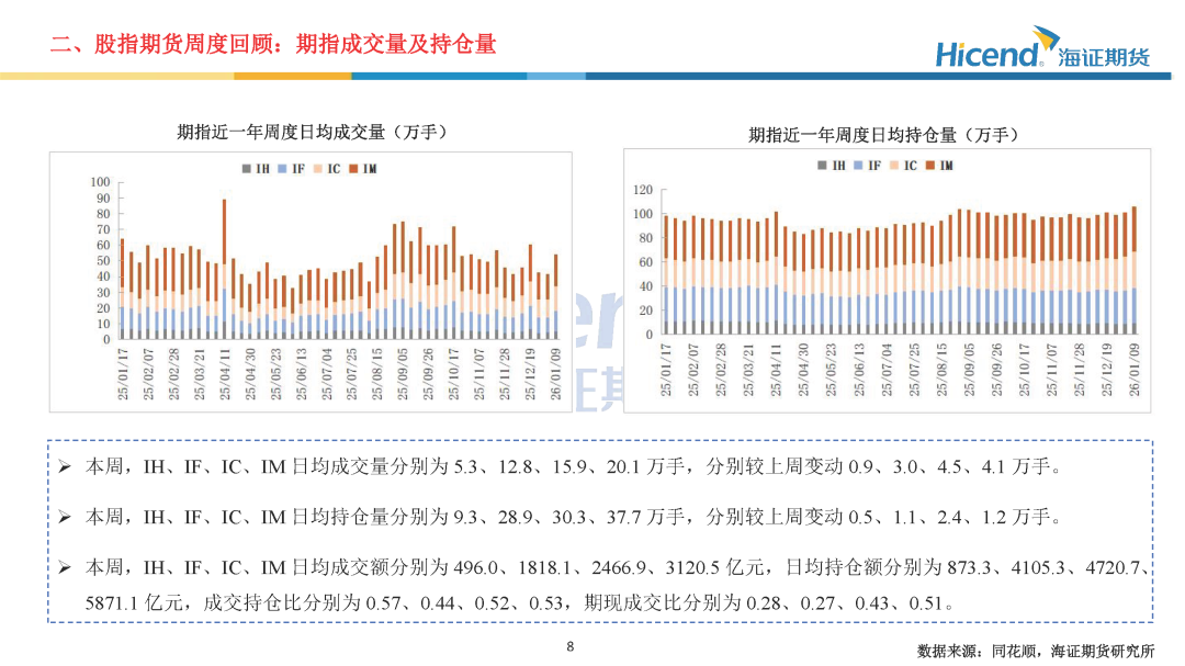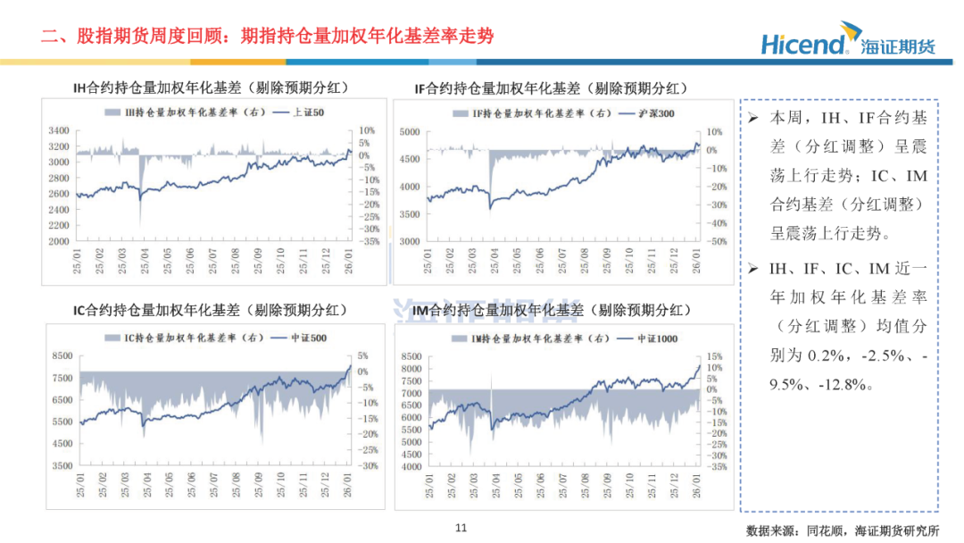 股指期货端,期指合约的整体日均成交量较上周显著上升,期指端的交投情绪相应走强。在剔除预期分红后,期指合约持仓量加权年化基差率方面,IH、IF、IC、IM期末持仓量加权年化基差率(分红调整)分别为-0.08%、0.16%、1.96%、-0.97%,分别较上周变动1.19%、3.06%、7.53%、7.38%。。