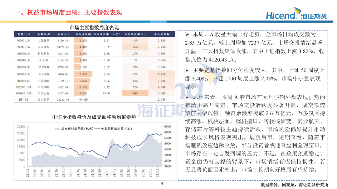 总体来看,本周A股市场在元旦假期外盘表现强势的带动下高开高走,市场交投活跃度显著升温,成交额较节前大幅放量,融资余额亦突破2.6万亿元,做多氛围持续高涨。板块层面,脑机接口、可控核聚变、商业航天、存储芯片等科技主题持续活跃,市场风险偏好提升推动科技成长风格表现突出。展望后市,短期来看,随着市场赚钱效应边际收敛,部分投资者或迎来盈利兑现窗口,市场存在一定自发回调的压力。不过,在政策预期稳定、资金面仍有支撑的背景下,市场情绪有望保持韧性,若无显著负面因素冲击,市场中长期向好格局有望持续。