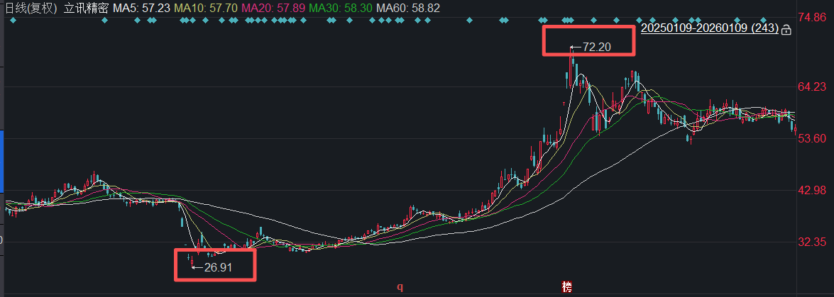 值得关注的是,这一回购定价展现出极强的信心。立讯精密股价自2025年4月9日创下26.91元的近一年新低后持续攀升,当年9月24日创下上市以来新高,此后虽有回落但仍维持高位震荡,截至2026年1月9日收盘价为55.65元,较前期低点已实现翻倍。以此计算,本次回购定价较2025年4月9日低点溢价223.15%,较2026年1月9日收盘价溢价56.26%。
