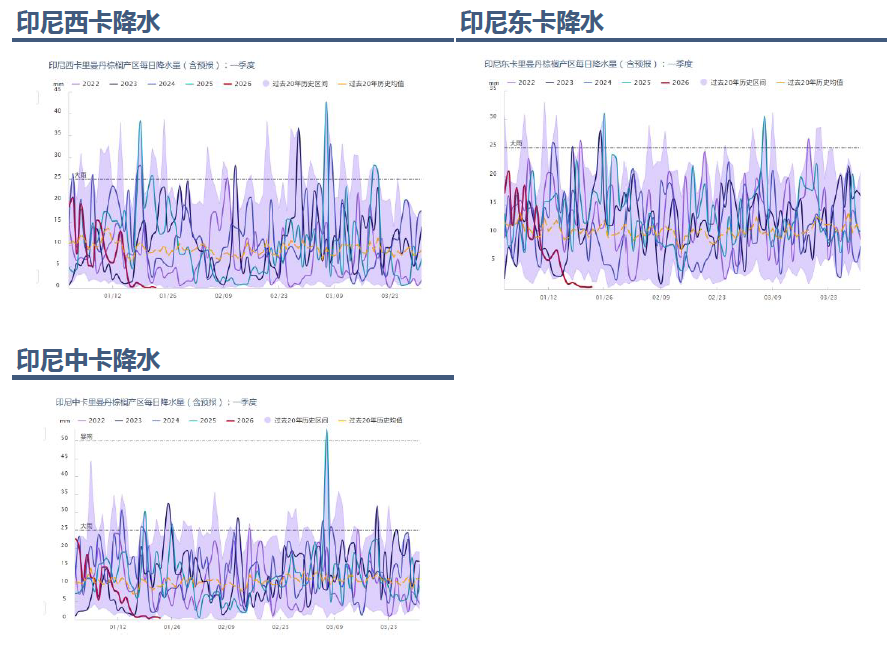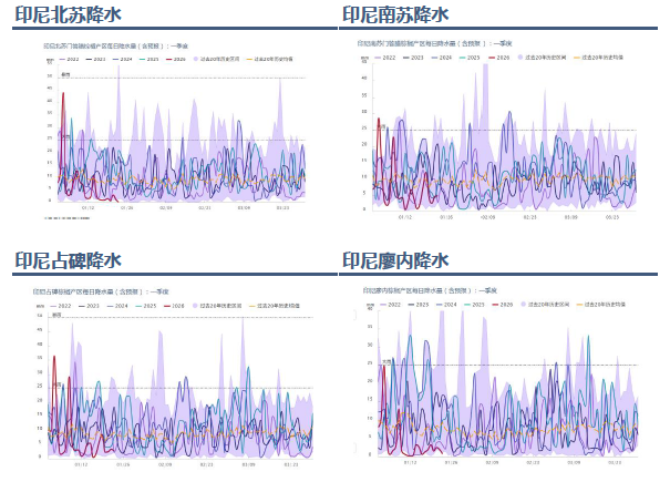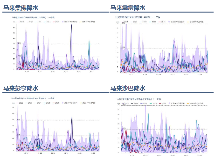 马来西亚主产区的旱情呈现西重东轻的格局,柔佛、彭亨干旱或较明显,霹雳地区如后续降雨不能补足也有偏干风险,持续少雨将直接导致土壤水分亏缺,若2月无改善,将严重影响花芽分化,对2026年第三季度产量构成实质性威胁;沙巴、沙捞越降水情况接近于常年,间歇性或略偏多的降雨有利于维持树势和花芽正常发育,为下半年产量提供了稳定基础。