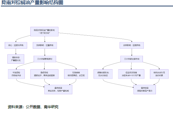 降水对棕榈油产量影响具有多面性,简单来说,降雨不足和过量降雨都不利于油棕树产量前景。