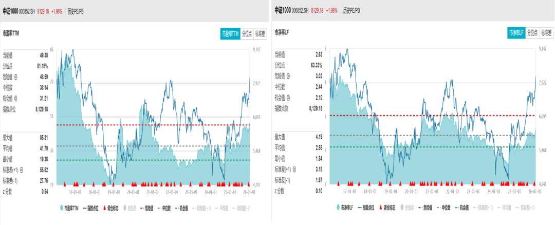 中证1000PE注册制改革以来分位点81%,PB分位数63%,估值中位。