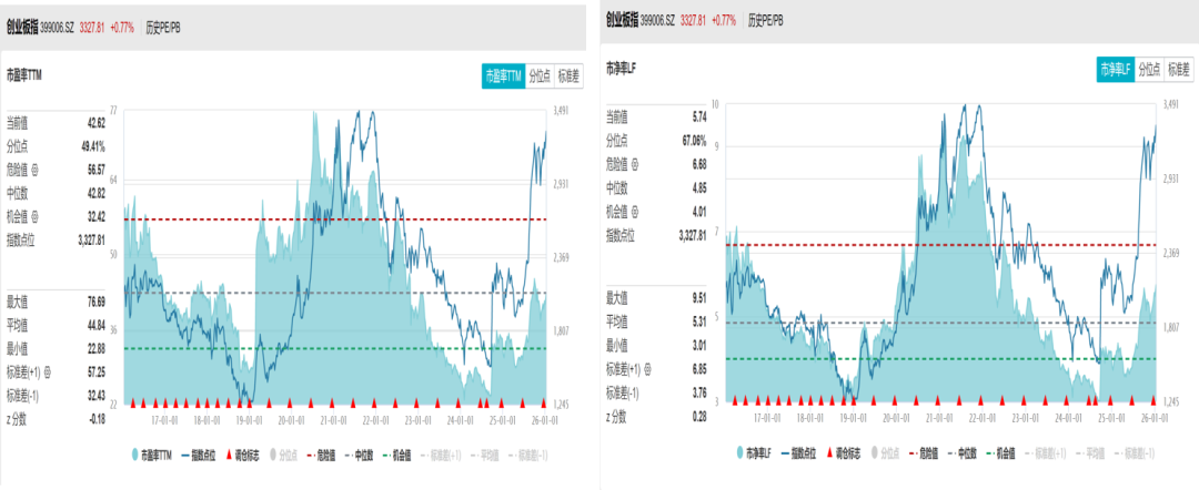 创业板指注册制以来估值PE分位数49%,PB分位数67%,处于中位的水平。