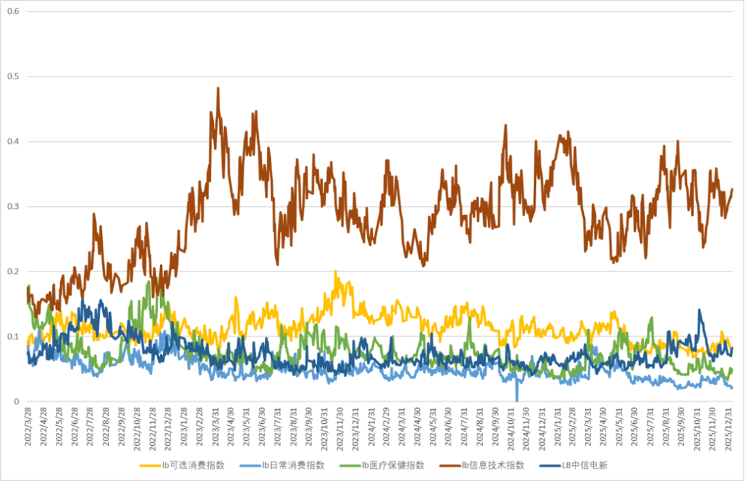 行业及ETF:偏多 上周市场行业表现上国防军工、娱乐和半导体行业领涨,银行、交通运输和石油石化等红利板块垫底。上周ETF市场传媒、军工、港股创新药、半导体、医疗、芯片等ETF领涨,银行、旅游、消费等ETF垫底。商业航天主题明显出现泡沫化迹象。上周A股传统行业中工业指数成交占比处于高位,材料指数成交占比持续回落,金融冲高回落、公用事业、房地产、能源指数继续低迷。新经济行业中可选消费、日常消费成交占比下降,医疗保健、信息技术、新能源成交占比回升。