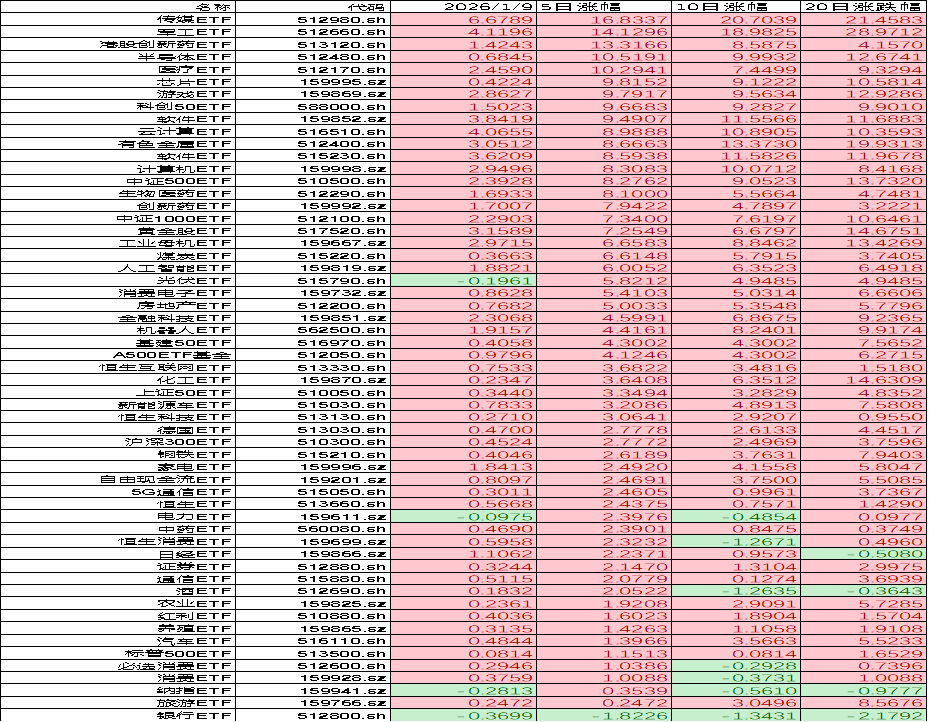 上周ETF市场传媒、军工、港股创新药、半导体、医疗、芯片等ETF领涨,银行、旅游、消费等ETF垫底。商业航天主题明显出现泡沫化迹象。