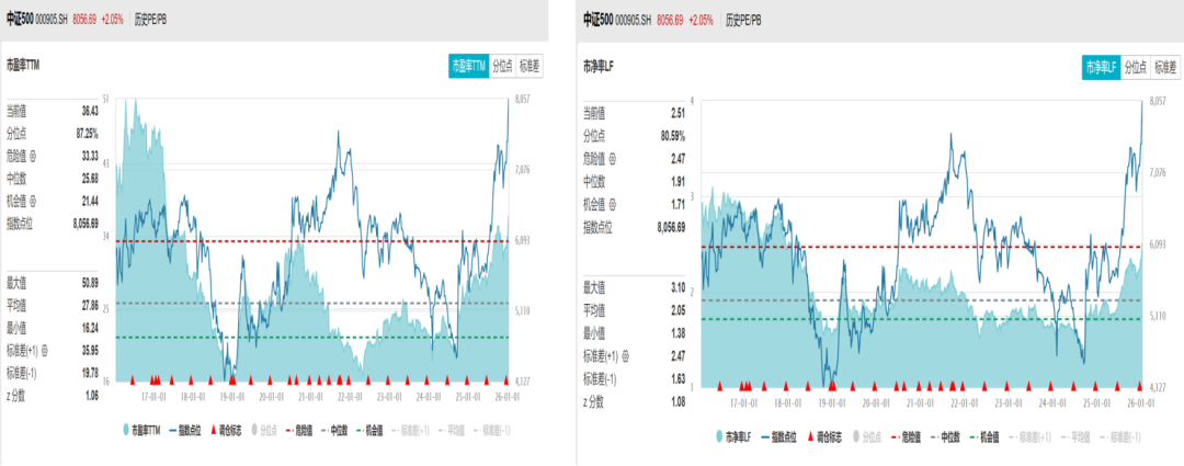 中证500PE注册制改革以来PE分位点87%,PB分位数80%,处于中高位。