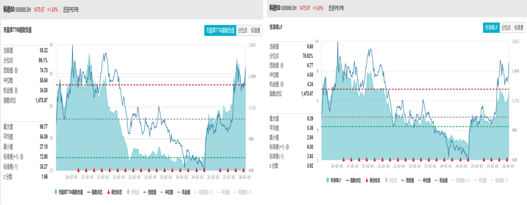 科创50注册制以来估值剔除负值PE分位数96%,PB分位数76%,处于高位的水平。