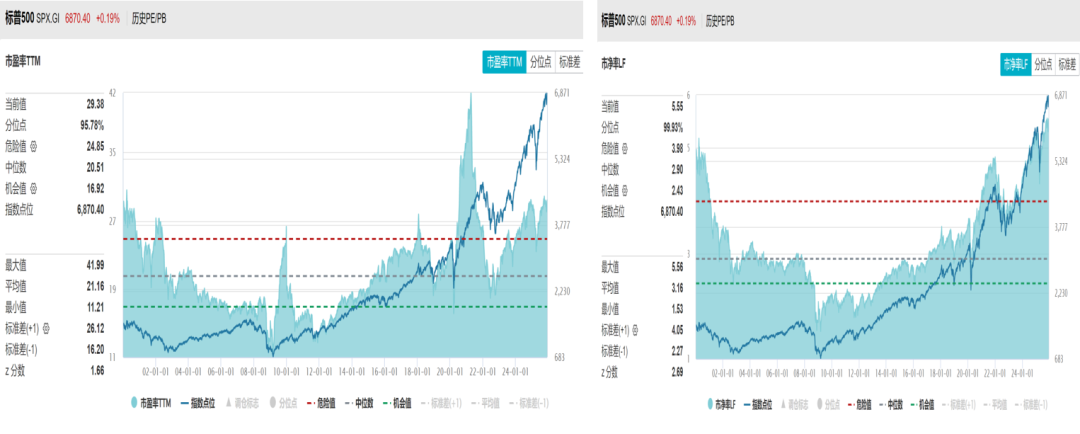 美股估值处于历史高位,SP500市盈率三十年分位数97%,市净率分位数99%。