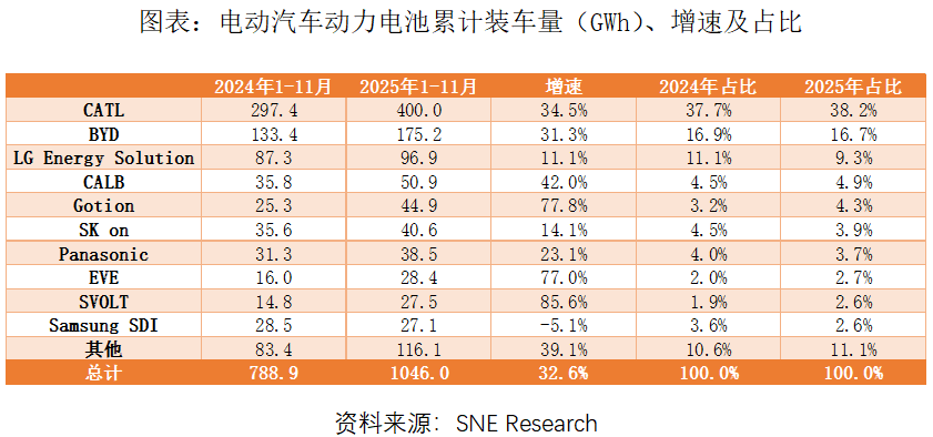 碳酸锂下游终端最主要的用途在于电动汽车和储能。国家发展改革委披露,截至2025年9月底,全国新型储能累计投运装机已超1亿千瓦,是“十三五”末的30倍以上,占全球总装机比例超过40%,发展势头强劲。据韩国研究机构SNE Research统计,中国2025年1-11个月累计交付电动汽车1231.5万辆,同比增21%,全球占比64.2%。宁德时代) href=/300750/>宁德时代(300750)、比亚迪) href=/002594/>比亚迪(002594)、中创新航、国轩高科) href=/002074/>国轩高科(002074)、亿纬锂能) href=/300014/>亿纬锂能(300014)、蜂巢能源六家我国电池企业跻身全球动力电池企业Top10。中国汽车动力电池产业创新联盟数据显示,2025年11月,国内动力电池月装车量93.5GWh,环比增11.2%,同比增39.2%。其中磷酸铁锂电池月装车量75.3GWh,占总装车量80.5%,环比增11.6%,同比增40.7%;三元电池月装车量18.2GWh,占总装车量19.4%,环比增9.9%,同比增33.7%。