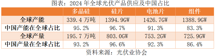 从全球供应格局来看,据中国光伏业协会(CPIA)数据,2024年,全球电池片产量1426.7GW,其中我国产能1302.58GW,在全球占比91.3%;全球电池片产量753.2GW,其中我国产量695.2GW,在全球占比92.3%。