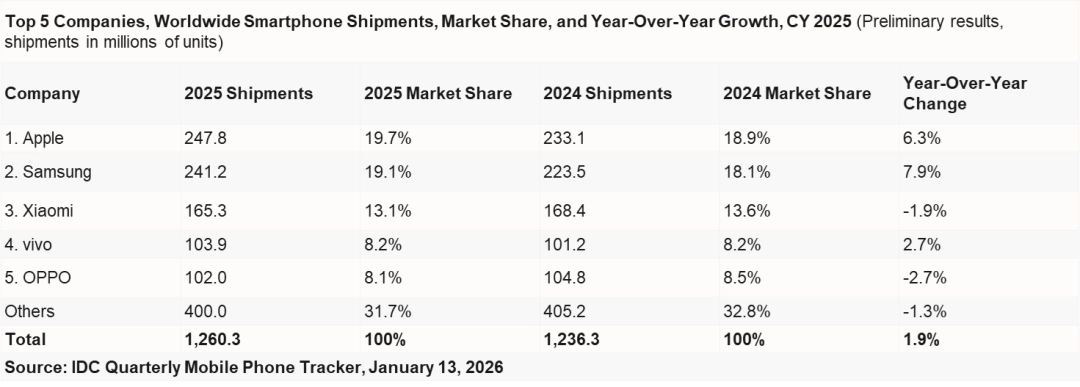 2025全年,全球智能手机出货量达到12.6亿部,同比增长1.9%。