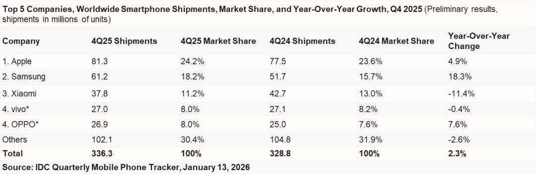 IT之家1月14日消息,IDC今日(1月14日)发布的《全球季度手机跟踪报告》初步数据显示,2025年第四季度(4Q25)全球智能手机出货量同比增长2.3%,达到3.363亿部。尽管受到存储芯片短缺的影响,市场仍在高端机型持续增长、折叠屏强劲表现以及消费者对未来涨价预期而提前换机的共同推动下实现增长。