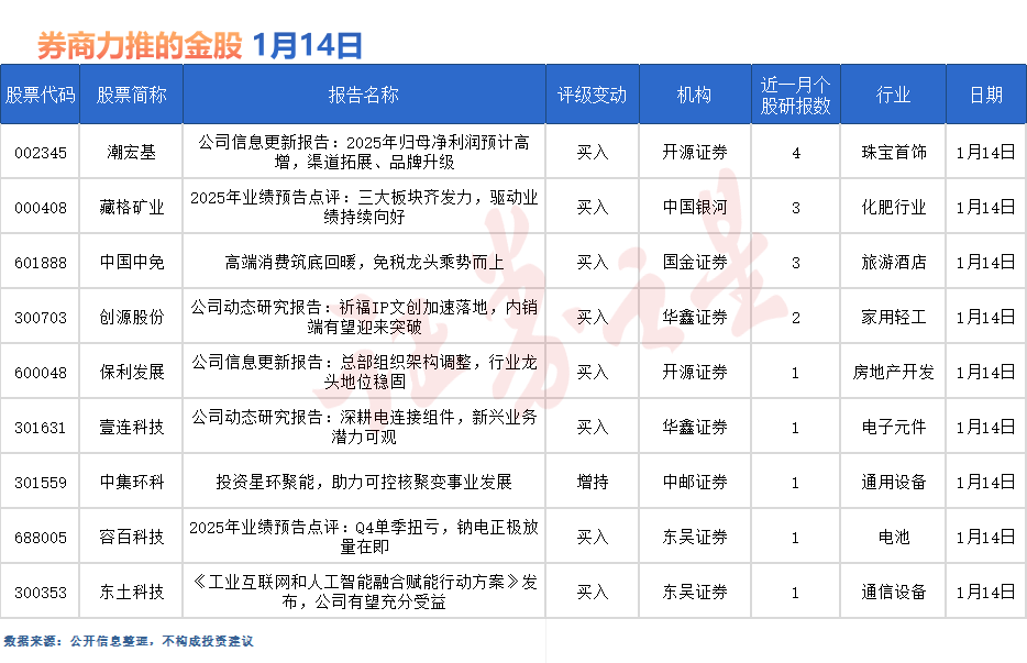 href=/002345/>潮宏基(002345)最受券商关注,近一个月获国信证券、国金证券等4份券商研报关注,仅1月14日就有开源证券、东吴证券等两份券商研报关注,位居1月14日券商力推股榜首。