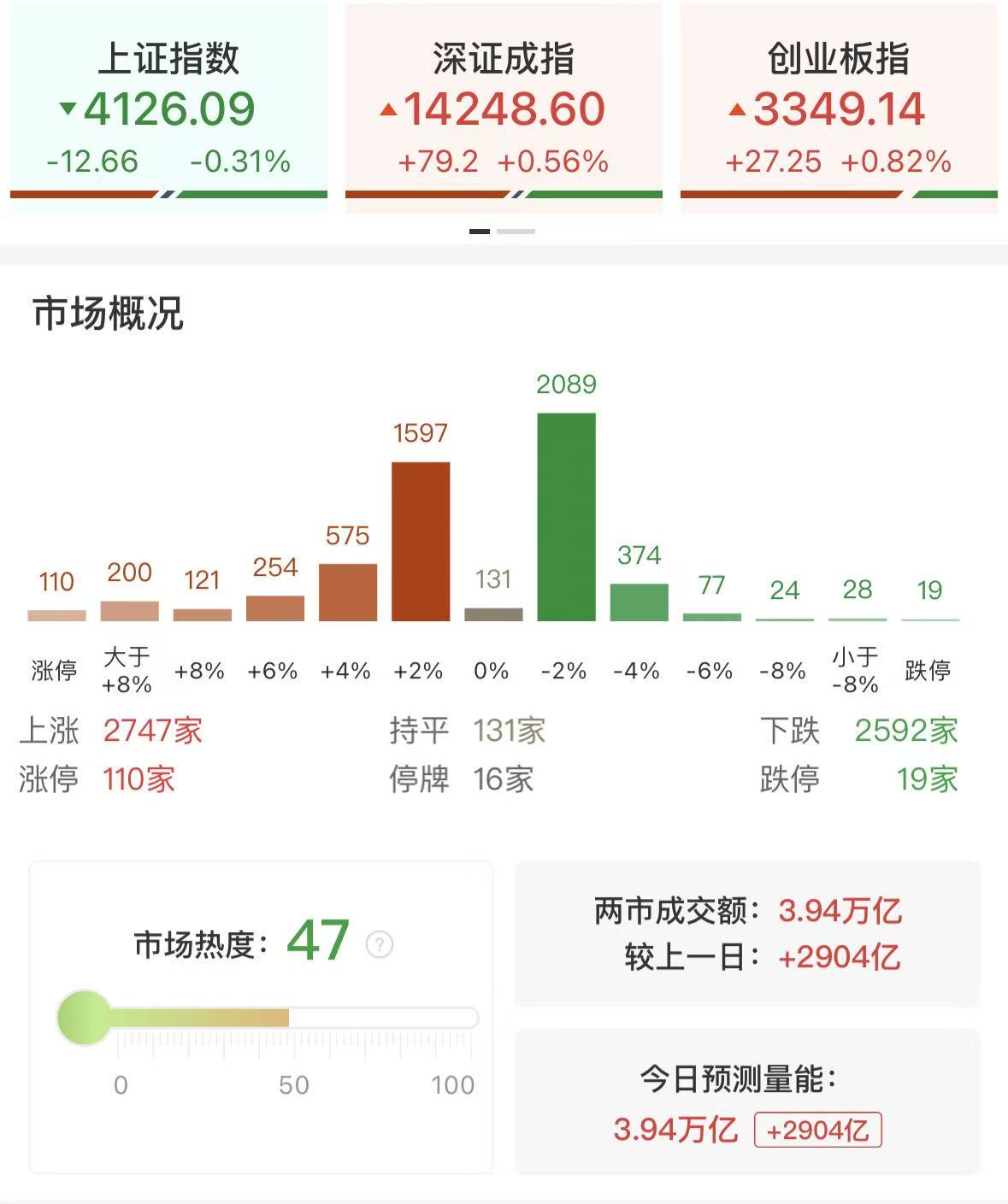 财联社1月14日讯,市场冲高回落,沪指午后快速翻绿,此前一度涨超1%。沪深两市成交额3.94万亿,较上一个交易日放量2904亿,连续第3个交易日突破3.5万亿。盘面上,市场热点快速轮动,全市场超2700只个股上涨。从板块来看,AI应用概念爆发,二十余只成分股涨停,利欧股份9天6板,省广集团4连板,新华网、人民网、三江购物3连板,壹网壹创3天2板。算力硬件概念午后拉升,光迅科技涨停创新高。半导体板块走高,亚翔集成涨停创历史新高。商业航天概念局部活跃,海格通信3连板创新高,大唐电信、佳缘科技等多股涨停。下跌方面,能源金属、保险、银行等板块跌幅居前。其中锂矿概念下挫,国城矿业触及跌停。截至收盘,沪指跌0.31%,深成指涨0.56%,创业板指涨0.82%。