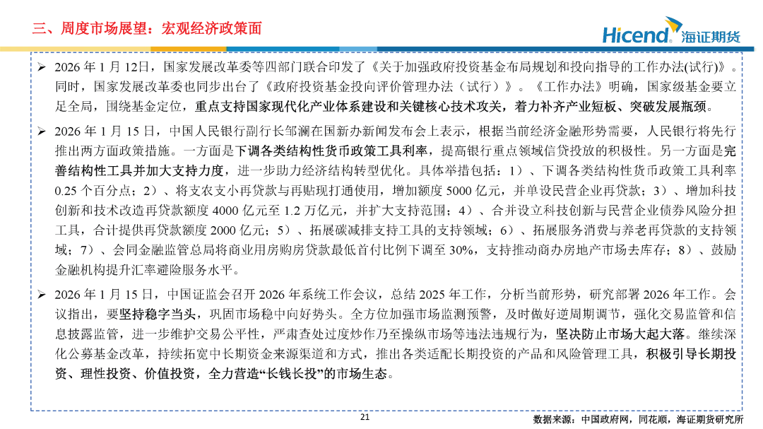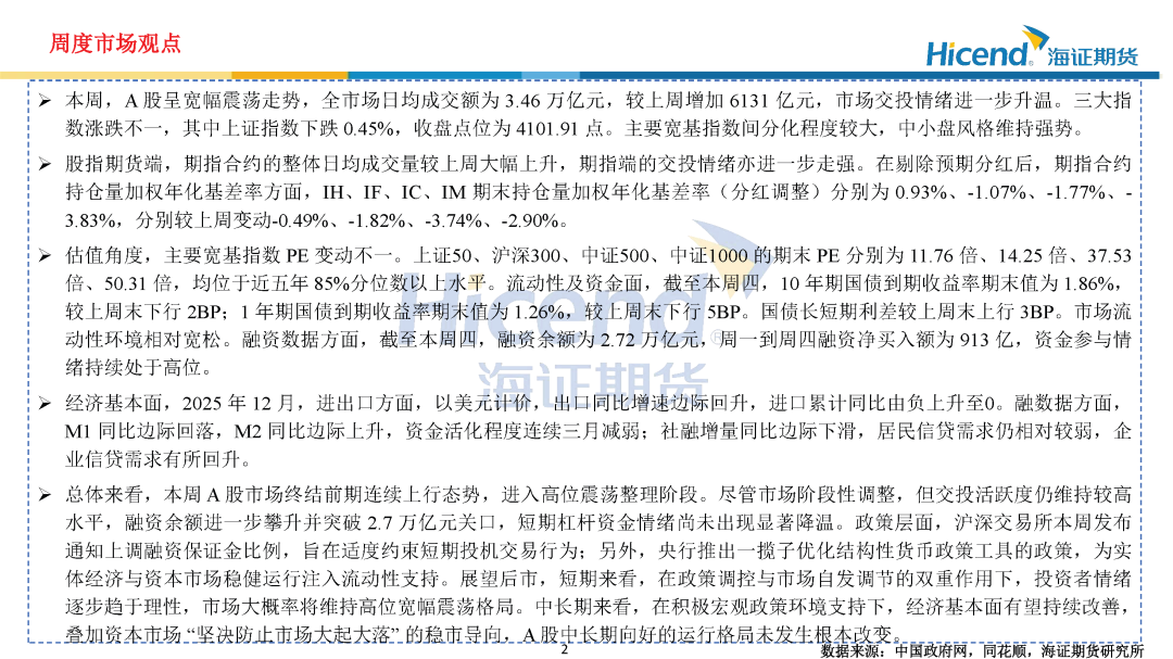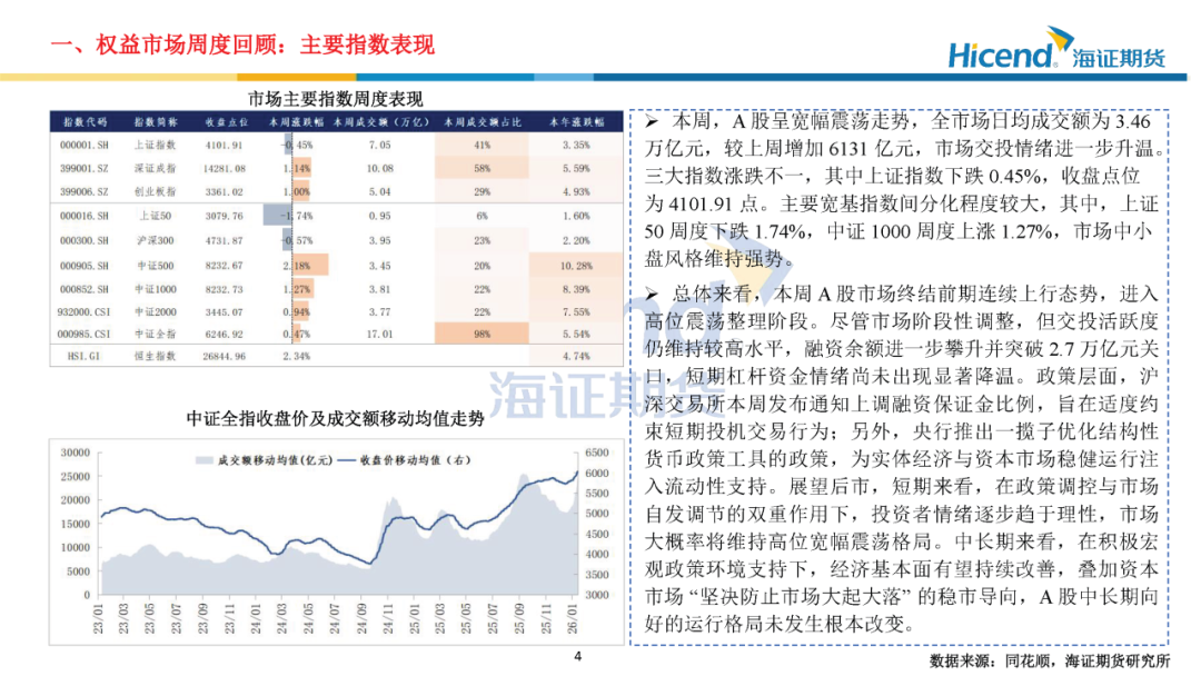 总体来看,本周A股市场终结前期连续上行态势,进入高位震荡整理阶段。尽管市场阶段性调整,但交投活跃度仍维持较高水平,融资余额进一步攀升并突破2.7万亿元关口,短期杠杆资金情绪尚未出现显著降温。政策层面,沪深交易所本周发布通知上调融资保证金比例,旨在适度约束短期投机交易行为;另外,央行推出一揽子优化结构性货币政策工具的政策,为实体经济与资本市场稳健运行注入流动性支持。展望后市,短期来看,在政策调控与市场自发调节的双重作用下,投资者情绪逐步趋于理性,市场大概率将维持高位宽幅震荡格局。中长期来看,在积极宏观政策环境支持下,经济基本面有望持续改善,叠加资本市场“坚决防止市场大起大落”的稳市导向,A股中长期向好的运行格局未发生根本改变。