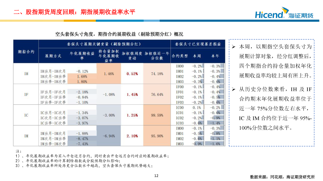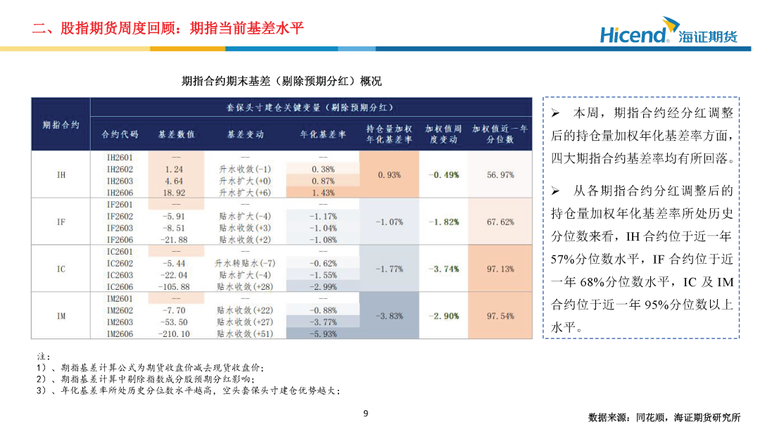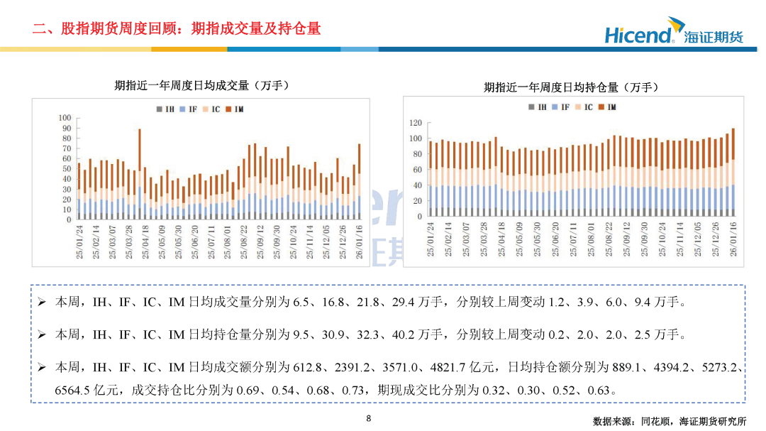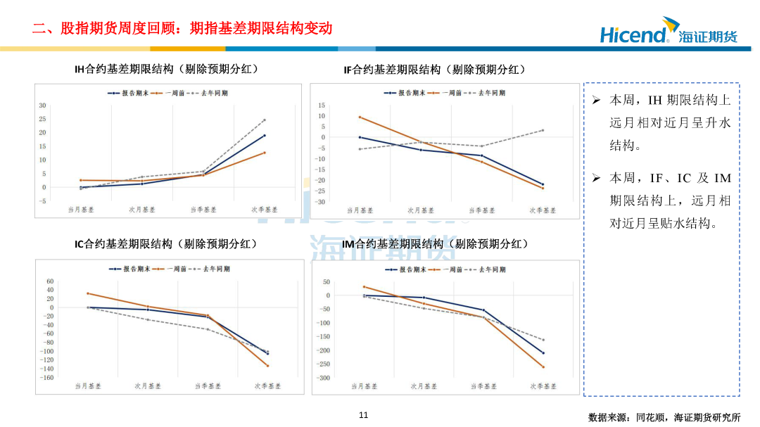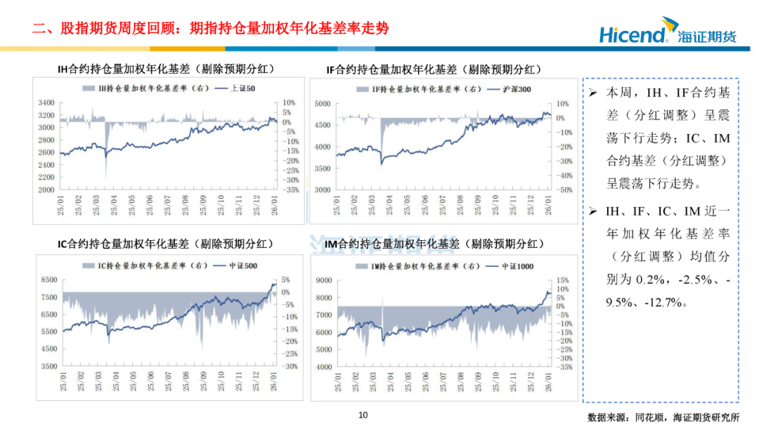 股指期货端,期指合约的整体日均成交量较上周大幅上升,期指端的交投情绪亦进一步走强。在剔除预期分红后,期指合约持仓量加权年化基差率方面,IH、IF、IC、IM期末持仓量加权年化基差率(分红调整)分别为0.93%、-1.07%、-1.77%、-3.83%,分别较上周变动-0.49%、-1.82%、-3.74%、-2.90%。