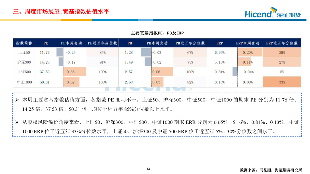估值角度,主要宽基指数PE变动不一。上证50、沪深300、中证500、中证1000的期末PE分别为11.76倍、14.25倍、37.53倍、50.31倍,均位于近五年85%分位数以上水平。流动性及资金面,截至本周四,10年期国债到期收益率期末值为1.86%,较上周末下行2BP;1年期国债到期收益率期末值为1.26%,较上周末下行5BP。国债长短期利差较上周末上行3BP。市场流动性环境相对宽松。融资数据方面,截至本周四,融资余额为2.72万亿元,周一到周四融资净买入额为913亿,资金参与情绪持续处于高位。