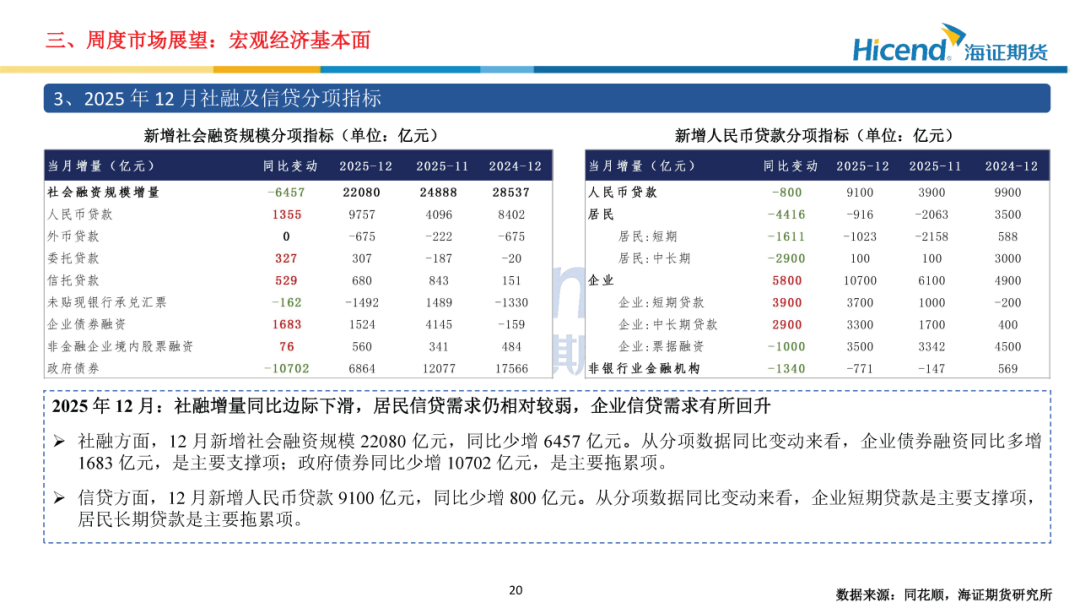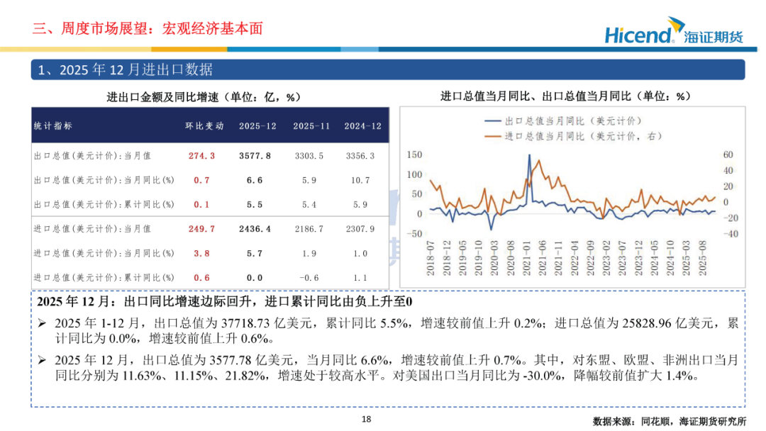 经济基本面,2025年12月,进出口方面,以美元计价,出口同比增速边际回升,进口累计同比由负上升至0。融数据方面,M1同比边际回落,M2同比边际上升,资金活化程度连续三月减弱;社融增量同比边际下滑,居民信贷需求仍相对较弱,企业信贷需求有所回升。