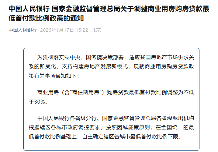 原标题:中国人民银行 国家金融监督管理总局关于调整商业用房购房贷款最低首付款比例政策的通知