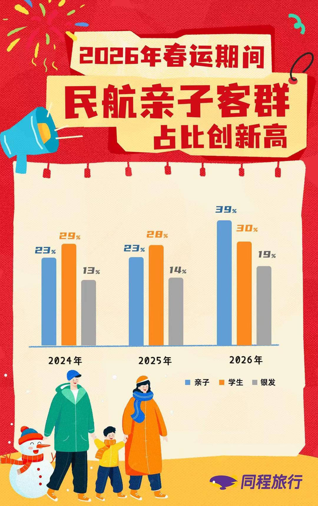 客群结构方面,今年春运期间亲子出行的比例较往年显著上升。《报告》数据显示,春运期间机票用户的亲子客群占比预计将达39%,显著高于去年同期水平。同时,60岁以上银发族占比将达19%,同样高于去年同期水平。