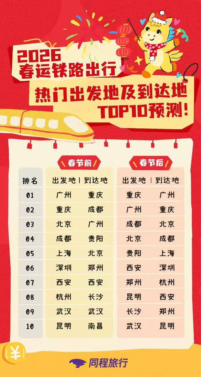1月20日,同程旅行发布了《2026年度春运旅行趋势报告》。《报告》显示,民航、铁路节前的第一波出行高峰预计出现在2月6日前后,节前的客流峰值预计出现在2月13日和14日两天。春运期间,国内航班的机票价格较去年同期略有上涨。春节前铁路热门出发城市主要集中于广州、重庆、北京等一线城市及区域中心城市,民航的热门出发城市则集中于上海、广州、深圳等一线城市。“史上最长春节假期”显著拉动了今年春运期间的多次出行需求。