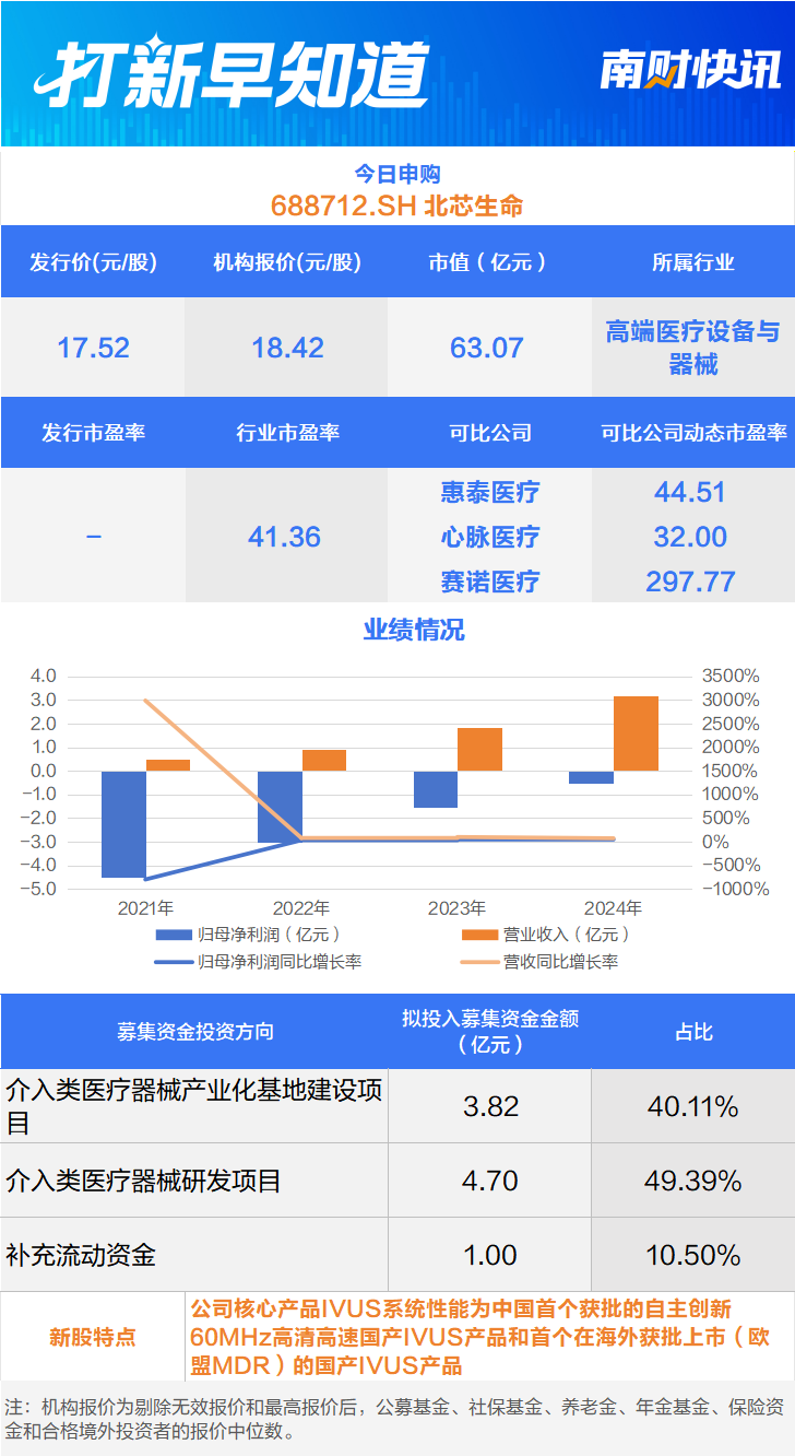 1月26日,可申购科创板的北芯生命(688712.SH)。该公司是一家专注于心血管疾病精准诊疗创新医疗器械研发、生产和销售的国家高新技术企业,致力于开发为心血管疾病诊疗带来变革的精准解决方案。