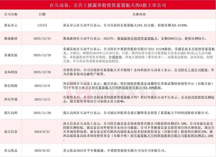 href=/000948/>南天信息(000948)等公司在互动易等平台证实参股投资蓝箭航天。但在回应市场关切时,多数公司口径一致地选择了低调。世纪华通在互动平台表示,公司对其的投资比例较小,相关投资事项对公司业绩无重大影响。截至发稿,世纪华通未回应记者关于投资蓝箭航天的进一步问询。