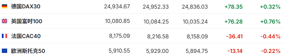 2. 截至发稿,德国DAX指数涨0.32%,英国富时100指数涨0.76%,法国CAC40指数跌0.44%,欧洲斯托克50指数跌0.22%。